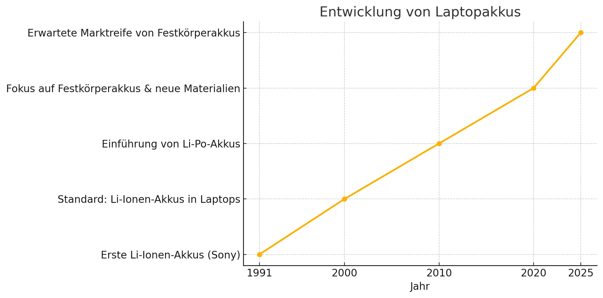 Was hat sich verändert? Frühere Akkus, vor allem Nickel-Cadmium- oder Nickel-Metallhydrid-Modelle, litten unter dem Memory-Effekt und waren anfällig für dauerhafte Ladung. Seit 1991 hat sich die Welt der Laptopakkus jedoch grundlegend gewandelt: Mit dem kommerziellen Durchbruch der Lithium-Ionen-Technologie durch Sony begann eine neue Ära. In den 2000er-Jahren wurde diese Technologie zum Standard, gefolgt von Lithium-Polymer-Akkus ab 2010, die noch flacher, leichter und leistungsfähiger sind. Heute richtet sich der Blick auf die Festkörpertechnologie, die nochmals mehr Kapazität und Sicherheit verspricht.